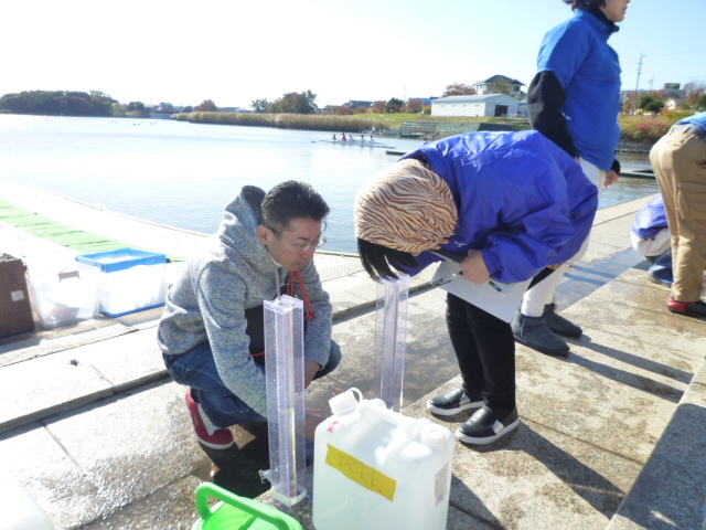 初参加者も多かった当社メンバーは、調査のやり方や汚染・浄化の仕組みを聞きがら、漕艇場前と南岸船着場の2地点の調査に張り切って取組んでくれました。
