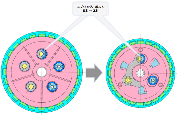 アシストカムは、クラッチレバー荷重の軽減による操作性向上と部品点数削減及びコンパクト化による環境性能向上を可能にします。